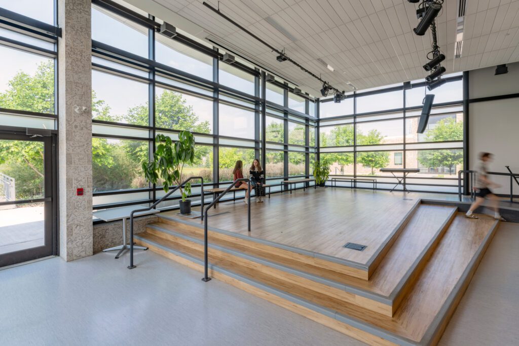 The new Student Commons and Main Entry additions at Collège Jeanne-Sauvé were designed to provide the school with a revitalized sense of community and connection to the outdoors for a growing student population. The Student Commons replaces a small cafeteria with an expansive gathering and eating space complete with a new kitchen and immediate access to new outdoor spaces, all connected by a stage that extends both inside and outside. The outdoor theatre/classroom, Indigenous Circle and raised garden beds create new opportunities for learning. The Student Commons addition allows the school to act as a hub for events, community gardening, and performances. The new Main Entrance to the school provides the building with a bright and welcoming entrance, opens up a busy corridor with pockets of space for students to gather and improves the overall circulation.